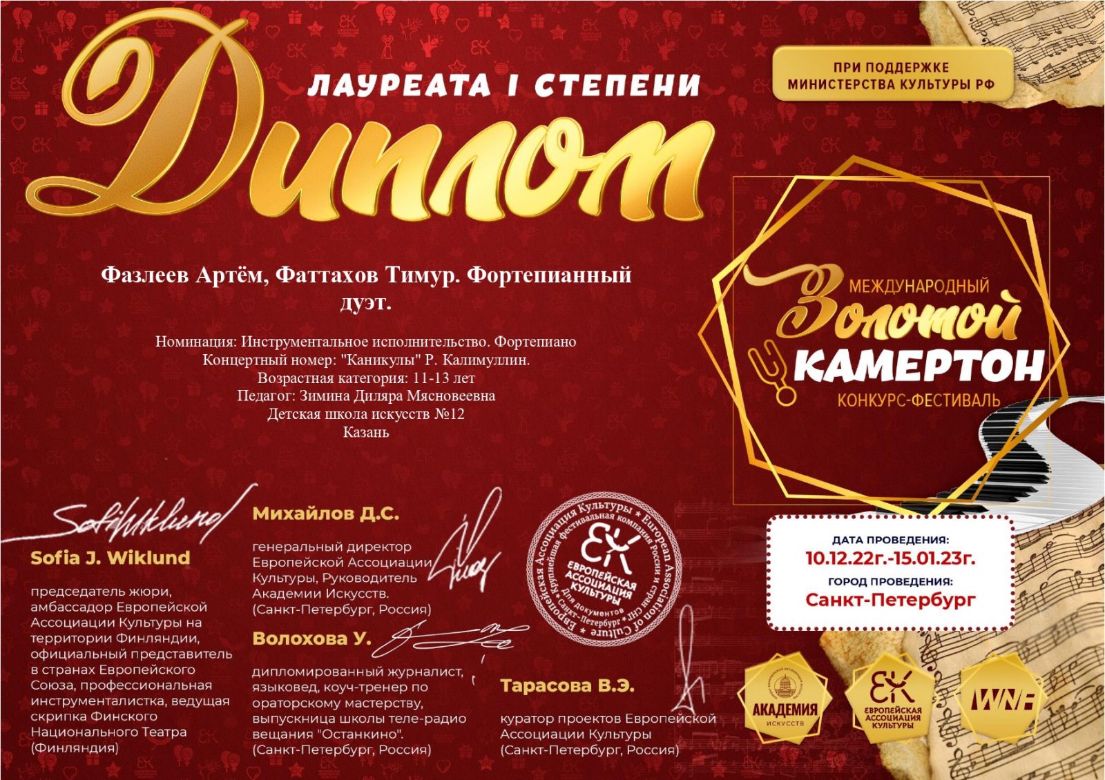 - Фортепианный дуэт: Фазлеева Артема, Фаттахова Тимура - Лауреатов 1 степени (преподаватель Зимина Д.М.). Номинация: Инструментальное исполнительство. Фортепиано. Возрастная категория: 11-13 лет.