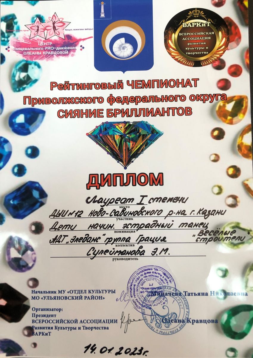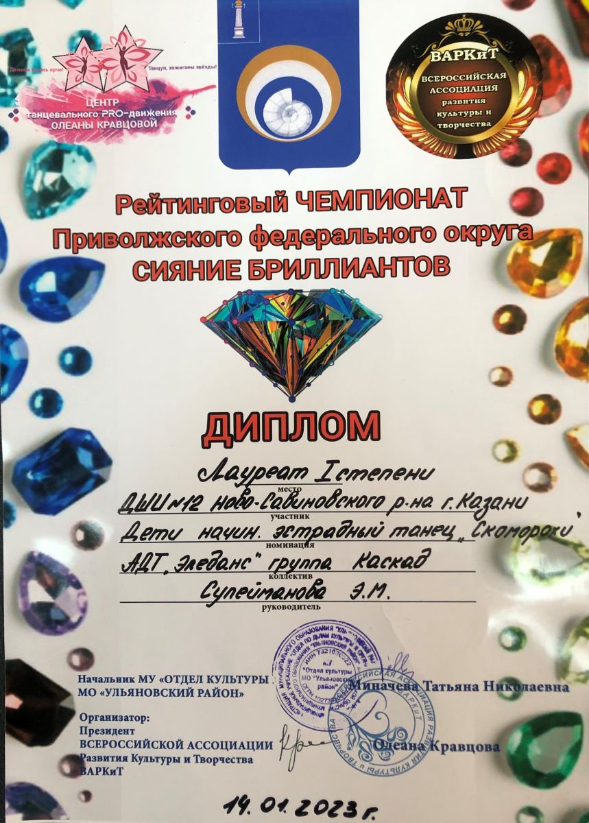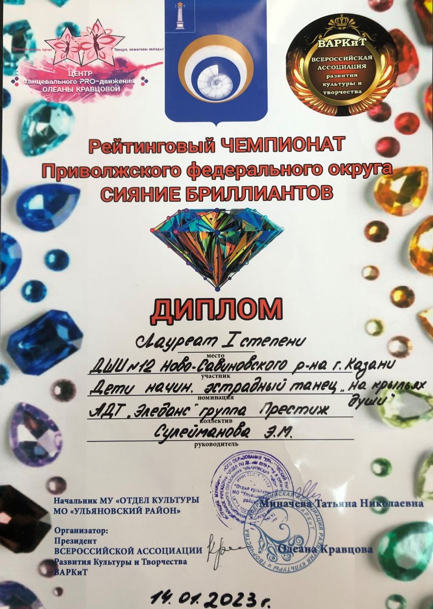 Поздравляем с успешным выступлением на Рейтинговом Чемпионате Приволжского федерального округа "Сияние бриллиантов" хореографический коллектив "Эледанс" руководителя Сулеймановой Эльвиры Миналиевны: