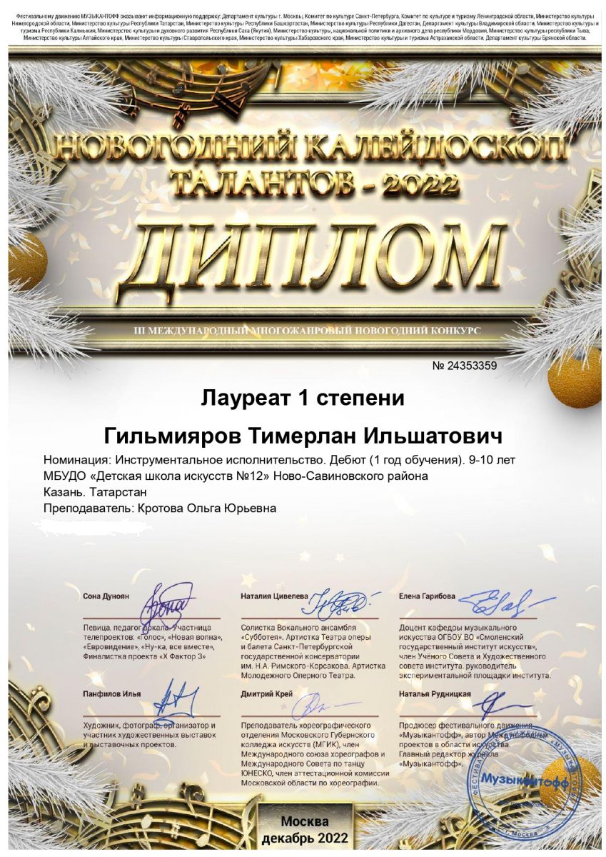 - Гильмиярова Тимерлана - Лауреата 1 степени (преподаватель Кротова О.Ю.) Номинация: Инструментальное исполнительство. Дебют (1 год обучения).