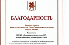 Администрация Авистроительного и Ново-Савиновского районов г. Казани выразила благодарность коллективу Детской школы искусств №15 за достигнутые успехи, высокие показатели по итогам 2019-2020 учебного года.