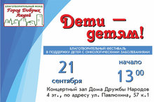 21 сентября в 13:00 в концертном зале Дома Дружбы Народов состоится благотворительный фестиваль в поддержку детей с онкологическими заболеваниями "Дети-Детям!