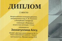 Зиннатуллина Алсу, ученица отделения изобразительного искусства ДШИ №15 (преподаватель Мухаметзянова Ф.М.) заняла 2 место во Всероссийском конкурсе творческих работ учащихся "В мире книг Л.Н. Толстого", посвященному году Л.Н. Толстого В Республике Татарстан.