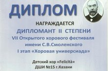Поздравляем детский хор ДШИ №15 "Felicita" и его руководителя Кудряшову Екатерину Владимировну c дипломом Дипломанта 2 степени VII Открытого хорового фестиваля имени С.В. Смоленского !