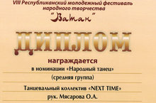 Танцевальный коллектив современного танца "Next time" и его руководитель Мясарова Ольга Александровна награждены Дипломами VIII Республиканского молодежного фестиваля народного творчества "ВАТАН" за творческую инициативу в области сохранения и развития искусств народов Татарстана.