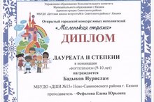 Поздравляем Бадыкова Нурислама (преподаватель Фефелова Е.Ю.) с Дипломом Лауреата 2 степени в Открытом городском конкурсе юных исполнителей "Маленькая страна"!