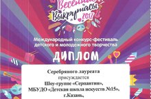 Поздравляем Шоу-группу "Серпанитин" (руководитель Марданова Г.М., преподаватель Яруллина Р.Р., хореограф Мусин Р.В., постановщик Бадьянова Т.Г.) с Дипломом Серебрянного лауреата Международного конкурс-фестиваля детского и молодежного творчества "Весенние выкрутасы 2017"