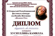 Поздравляем Хуснуллину Камиллу, учащуюся ДШИ №15 (преподаватель Груйич М.М.) с Дипломом лайреата III степени II Открытого Республиканского фестиваль конкурса им. Назиба Жиганова "Жиганов - Vivo"