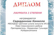 Поздравляем учащуюся ДШИ №15 Сададдинову Камиллу (пропадаватель Марданова Г.М.) с победой в Городском конкусре эстрадного вокала "Рождественское сияние" - Диплом лауреата I степени