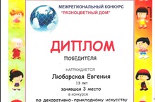 Поздравляем Любарскую Евгению, учащуюся ДШИ №15, с получением Диплома победителя, занявшую III место в Межрегиональном конкурсе по декоративно-прикладному искусству "Разноцветный мир".