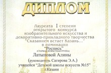 Поздравляем Латыпову Алину, учащуюся ДШИ №15, с получением Диплома лауреата I степени Открытого конкурса изобразительного искусства и декоративно-прикладного творчества "Сказанием встает Казань..." в номинации "Роспись".