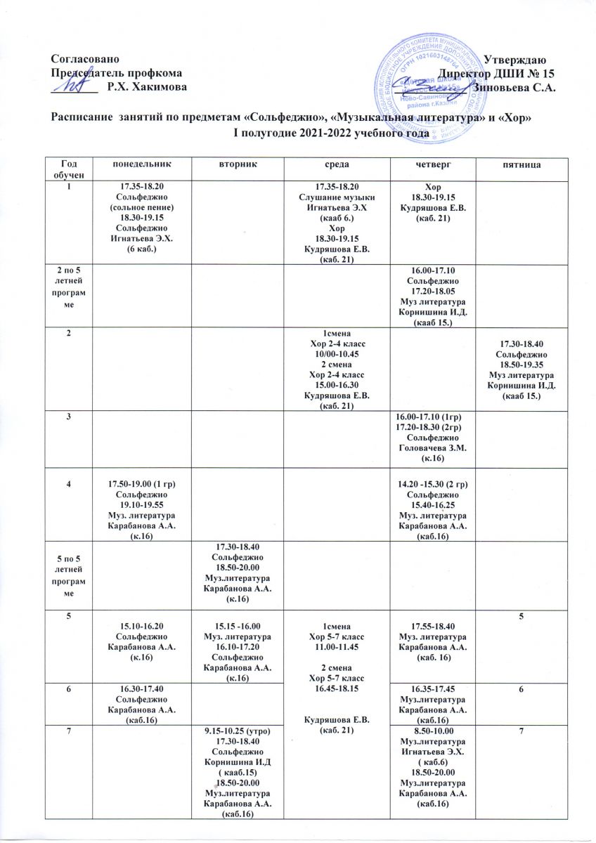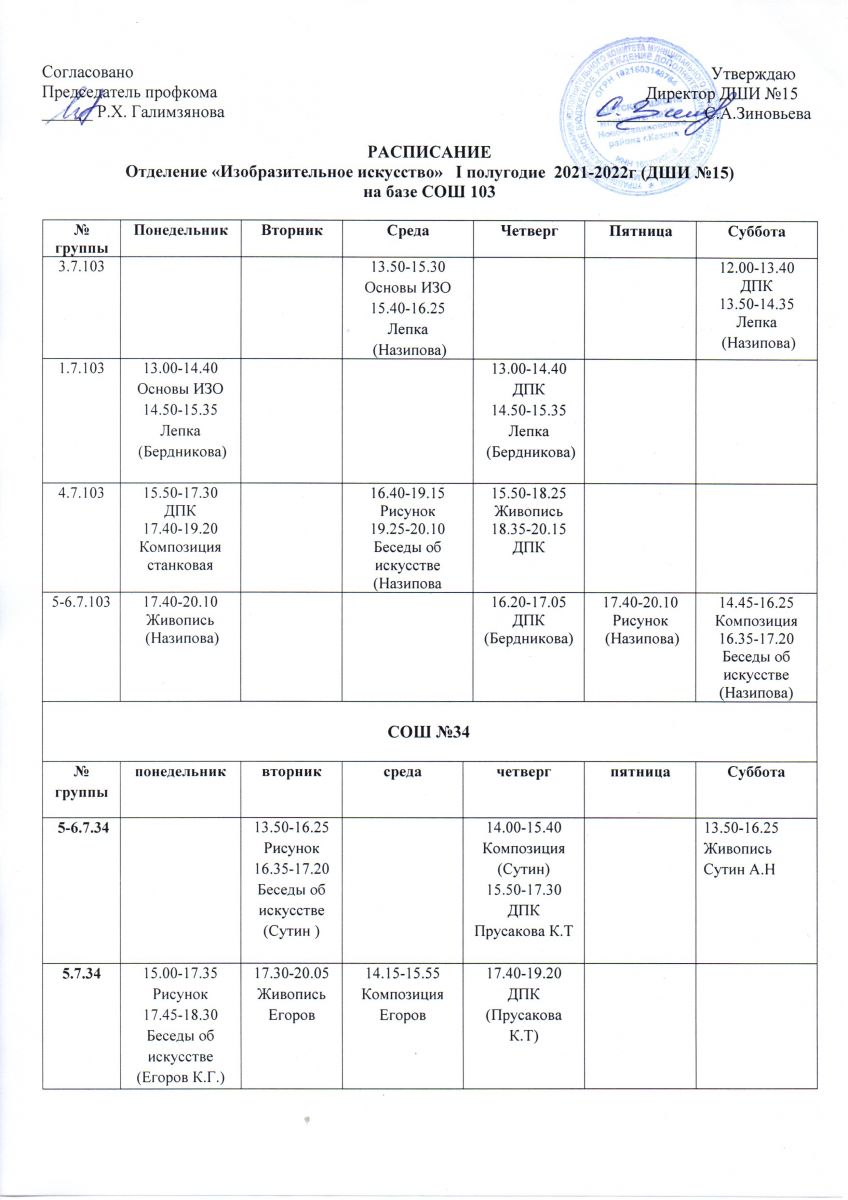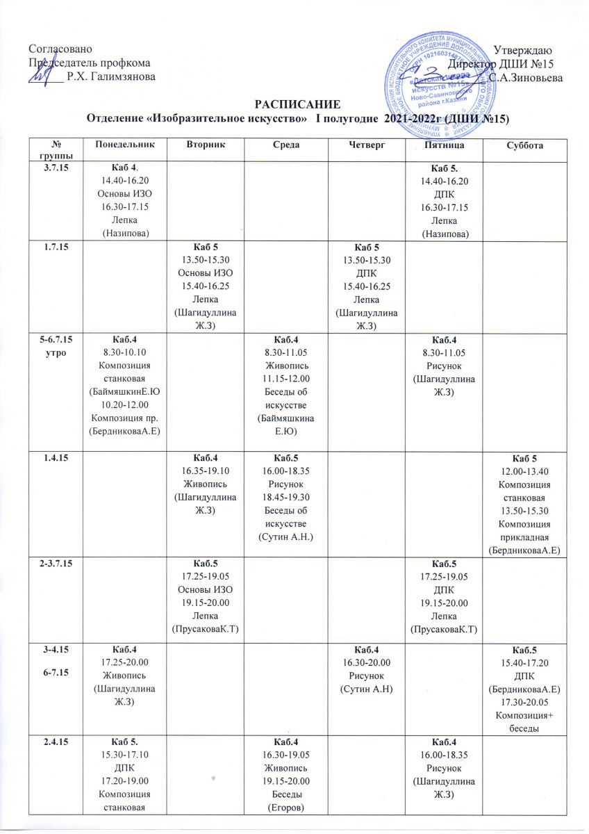 Расписание Отделения "Изобразительного искусства" 1 полугодие 2021-2022 учебного года (ДШИ №15)
