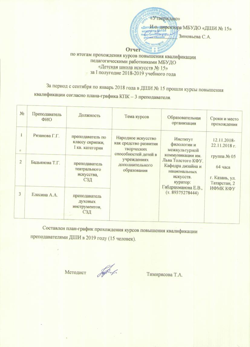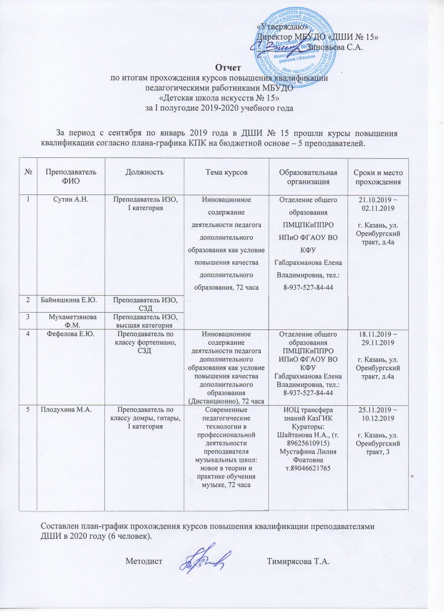 Отчет о прохождении курсов повышения квалификации преподавателями ДШИ №15 в 2019-2020 учебном году