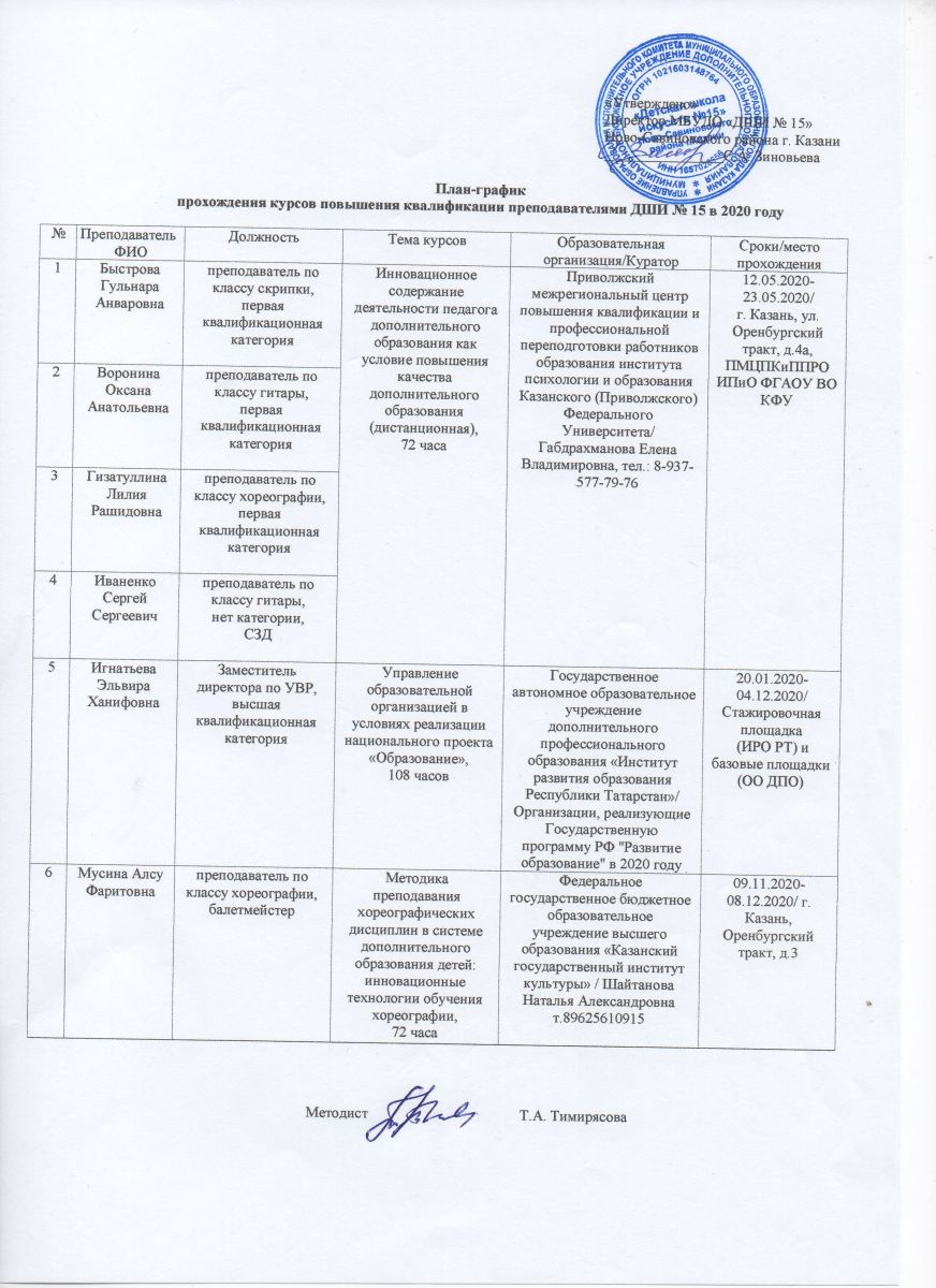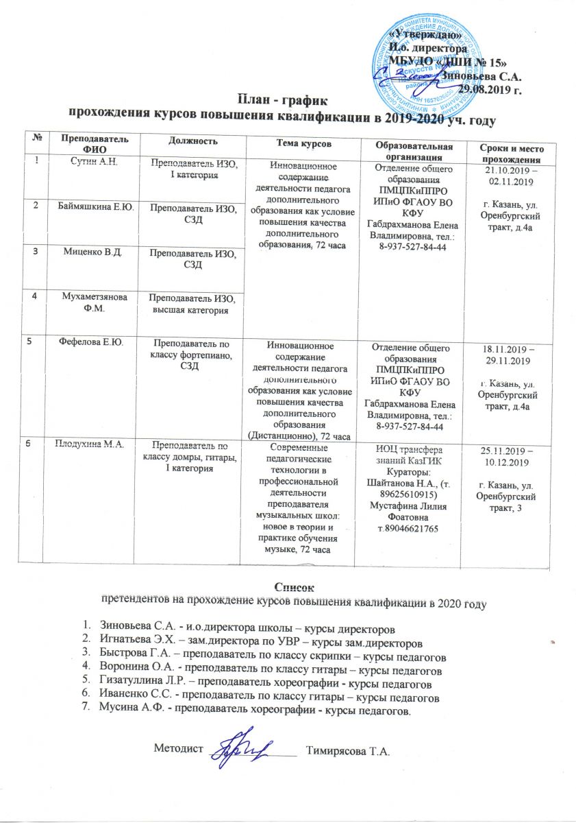 План-график прохождения курсов повышения квалификации преподавателями ДШИ №15 в 2020 году