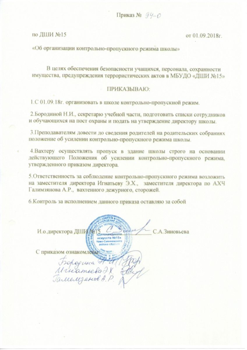 Приказ по ДШИ №15 "Об организации контрольно-пропускного режима школы" от 02.09.2019г.