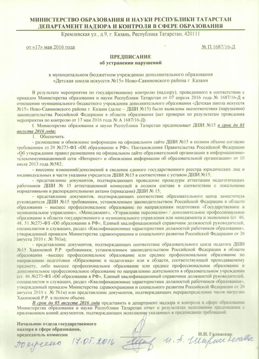 Предписание об устранении нарушений в МБУДО "ДШИ №15" от 17.05.2016г.
