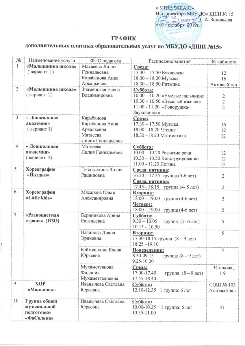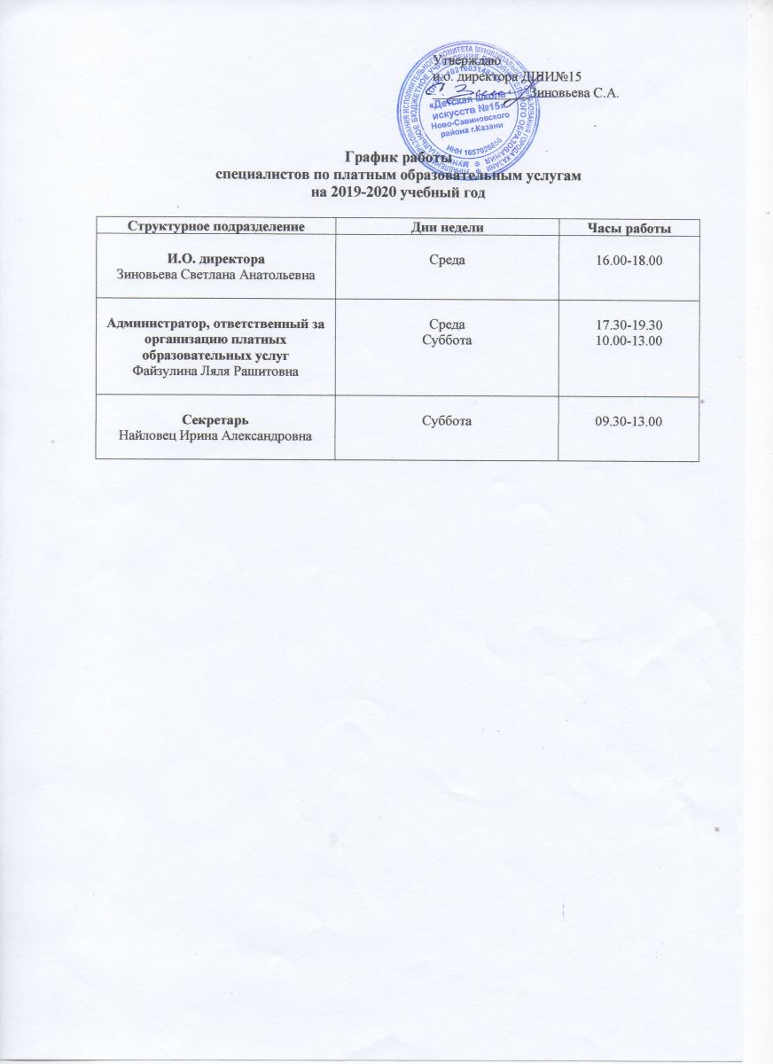 График работы специалистов по платным образовательным услугам на 2019-2020 учебный год