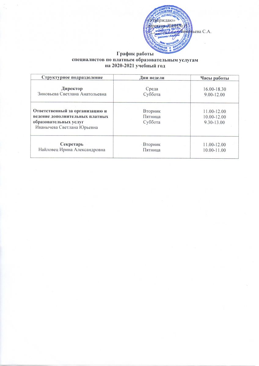 График работы специалистов по платным образовательным услугам на 2020-2021 учебный год