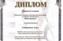 Сабирзянов Алим - лауреат II степени ( преподаватель Мухутдинов Р.Т., концертмейстер Мамедова Б.Н.);