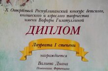 12 марта 2023 года в Казани состоялся X Открытый Республиканский конкурс детского, юношеского и взрослого творчества им. Вафиры Гизатуллиной. Поздравляем Валиеву Диану и ее преподавателя Саламатину Светлану Николаевну с дипломом лауреата I степени, а также Маннапову Мадину и Ахметшину Гузель Гилфановну с дипломом лауреата II степени! Желаем дальнейших творческих побед!