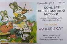 10 декабря в 18.30 в зале школы состоится концерт фортепианной музыки "От мала до велика" обучающихся класса преподавателя Саламатиной Светланы Николаевны. Приглашаются все желающие.