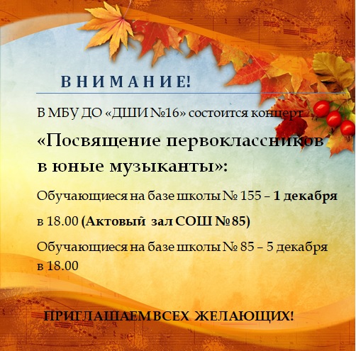 1 декабря в актовом зале СОШ № 85 прошёл ежегодный концерт "Посвящение в юные музыканты" для первоклассников структурного подразделения на Четаева.