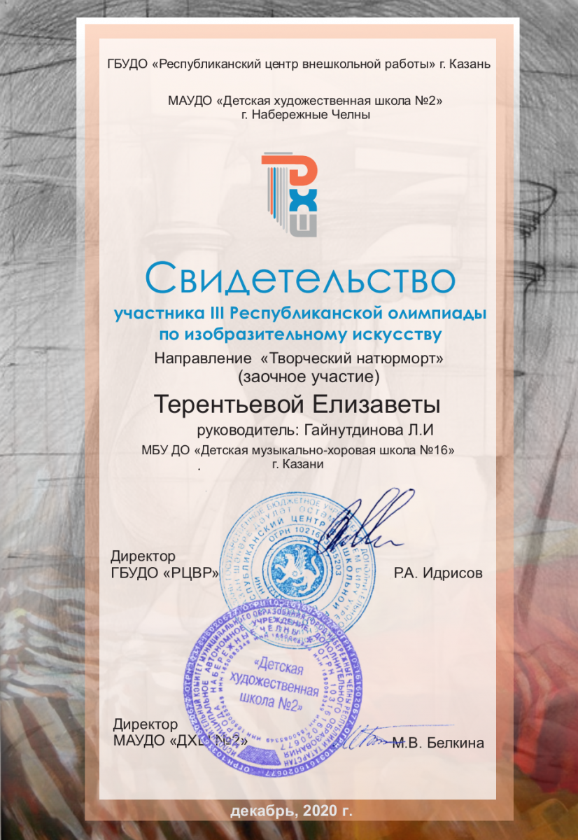 20. Терентьтева Е. - Сертификат участника олимпиады по ИЗО г. Набережные Челны.png