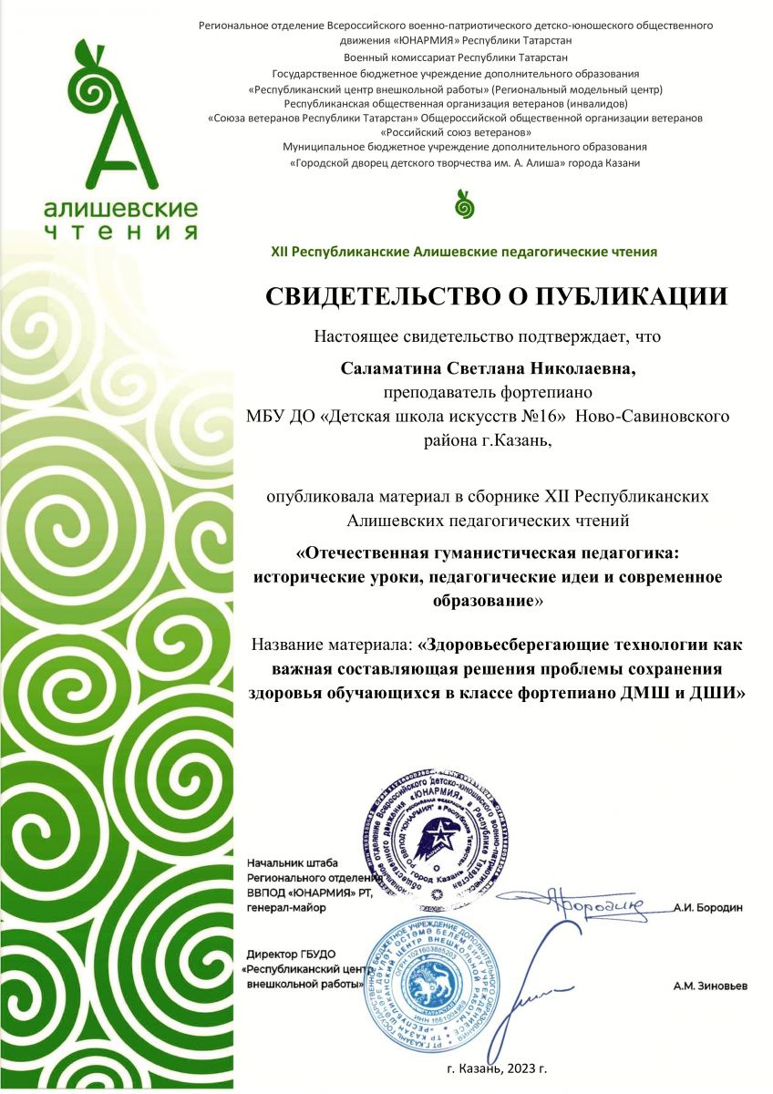 26.Саламатина С.Н. - свидетельство о публикации "Алишевские педагогические чтения"