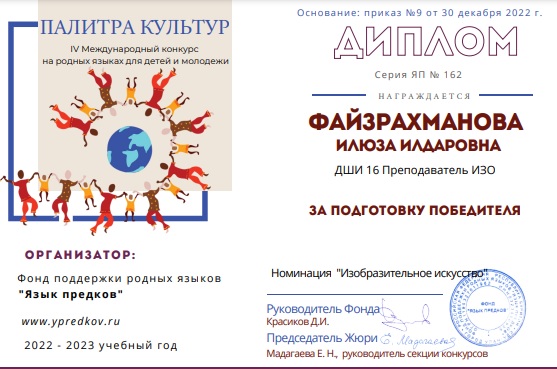 Опубликовано: 08.02.2023Поздравляем Хасбиуллину Ильвин и ее преподавателя Файзрахманову И.И. с дипломом Гран-при на IV международном конкурсе на родных языках для детей и молодежи "Палитра культур"!