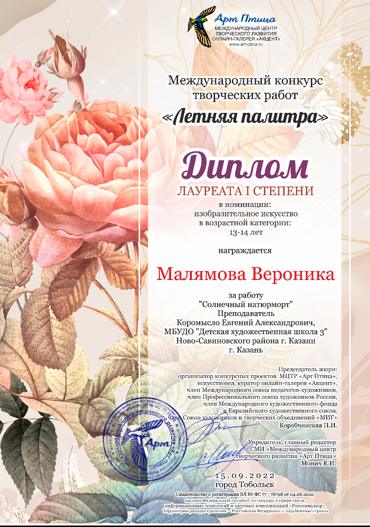 Поздравляем! Малямову Веронику, с Дипломом ЛАУРЕАТА IСТЕПЕНИ в номинации: Изоразительное искусство, за работу "Солнечный натюрморт"