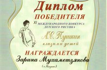 Представленная ею работа "А.С.Пушкин в лицее" была отмечена Государственным историко-литературным музеем-заповедником А.С.Пушкина, редакцией журнала "Юный художник" при поддержке Министерства культуры Московской области.Отдельные поздравления преподавателю Зарины - Михеевой Марине Ивановне за успешный педагогический труд! Побольше Вам талантливых учеников!!!