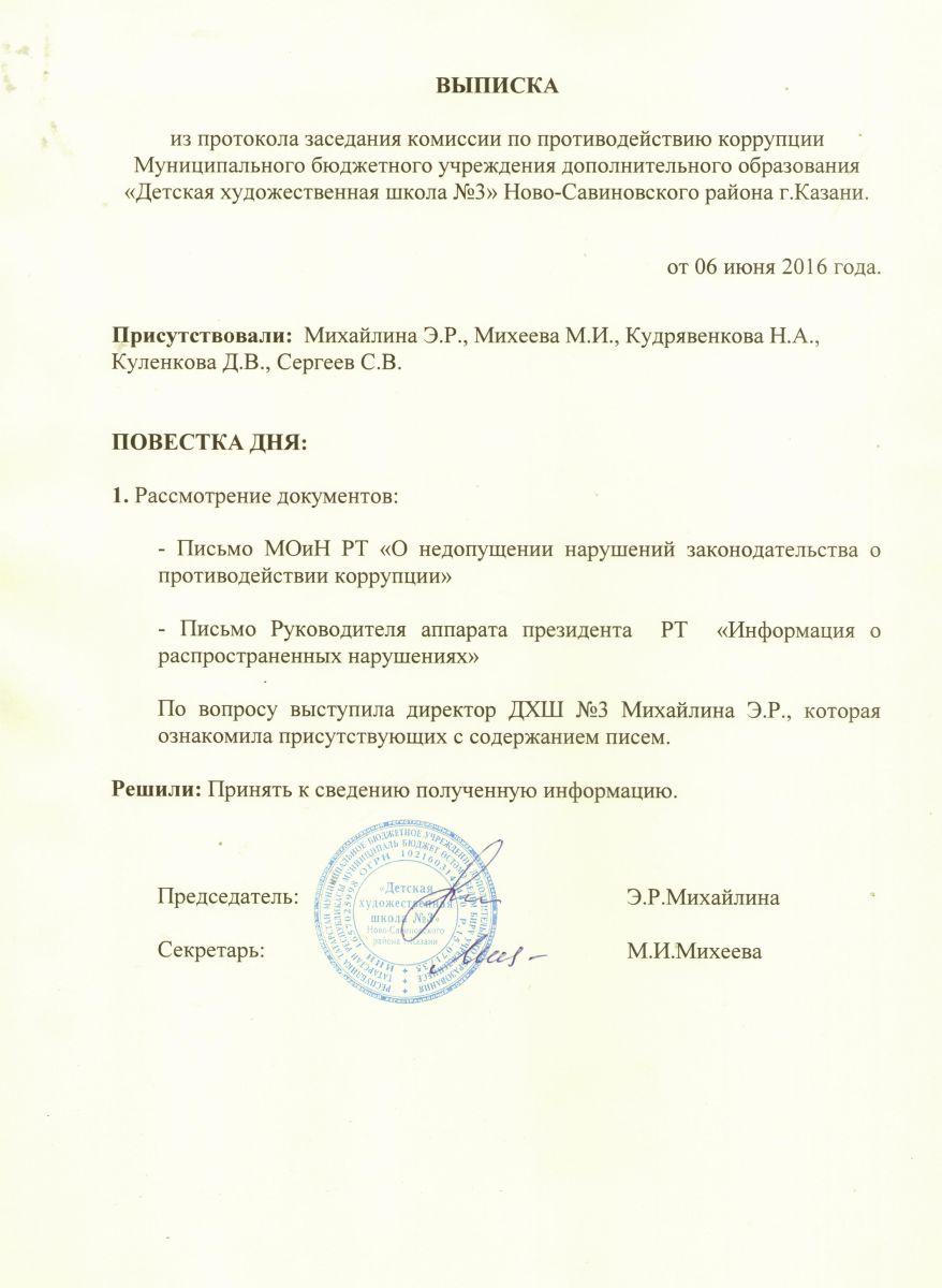 Выписка из протокола заседания комиссии по противодействию коррупции МБУДО "ДХШ №3"
