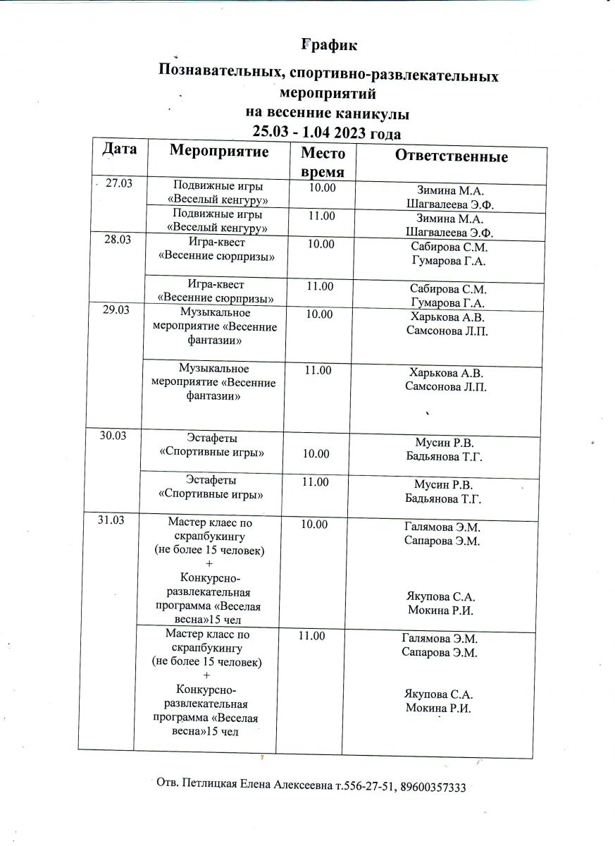 План мероприятий на весенние каникулы 01.03.2023