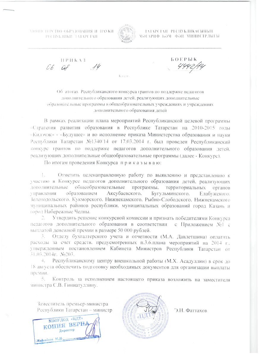 Приказ об итогах Республиканского конкурса грантов 2014г.