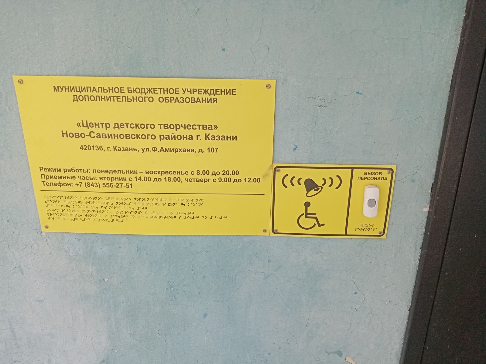 В МБУДО "ЦДТ созданы условия для инвалидов и лиц с ОВЗ: входная зона - имеется пандус, тактильная табличка с кнопкой вызова помощи, для слабовидящих инвалидов - вывеска с наименованием учреждения, выполненная рельефно-точечным шрифтом Брайля на контрастном (жёлтом) фоне.