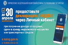 УФНС России по Республике Татарстан в рамках проведения ежегодной декларационной кампании и в целях информирования широкого круга лиц направляет баннер и листовку "До 30 апреля предоставьте декларацию 3-НДФЛ через личный кабинет".