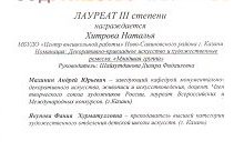 Поздравляем учащуюся объединения “Волшебная кисточка” Хитрову Наталью (педагог Шайхутдинова Д.Ф.) с получением диплома лауреат III степени в номинации декоративно-прикладное товрчество и художественные ремесла в XI Международном фестивале-конкурсе детского и юношеского творчества “Содружество Талантов”.