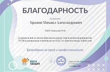 Благодарим за активное участие и победу в «XI Международной олимпиаде по ПДД» от проекта mega-talant.com обучающихся объединения «Юные инспектора движения». Поздравляем педагога Храмова Михаила Александровича за участие и победу в Международном конкурсе по правилам дорожного движения (ПДД) и с получением Благодарности за труд и профессионализм.