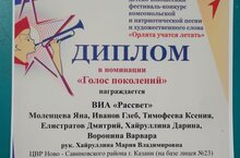 26 октября 2023 года обучающиеся отдела музыкально-сценического искусства Вокально-инструментальный ансамбль «Рассвет» под руководством педага дополнительного образования Хайруллиной М.В. приняли участие в IV Всероссийском детско-юношеском фестивале-конкурсе комсомольской и патриотической песни и художественного слова «ОРЛЯТА УЧАТСЯ ЛЕТАТЬ» и стали дипломантами в номинации «Голос поколений». Поздравляем и желаем дальнейших побед!!!
