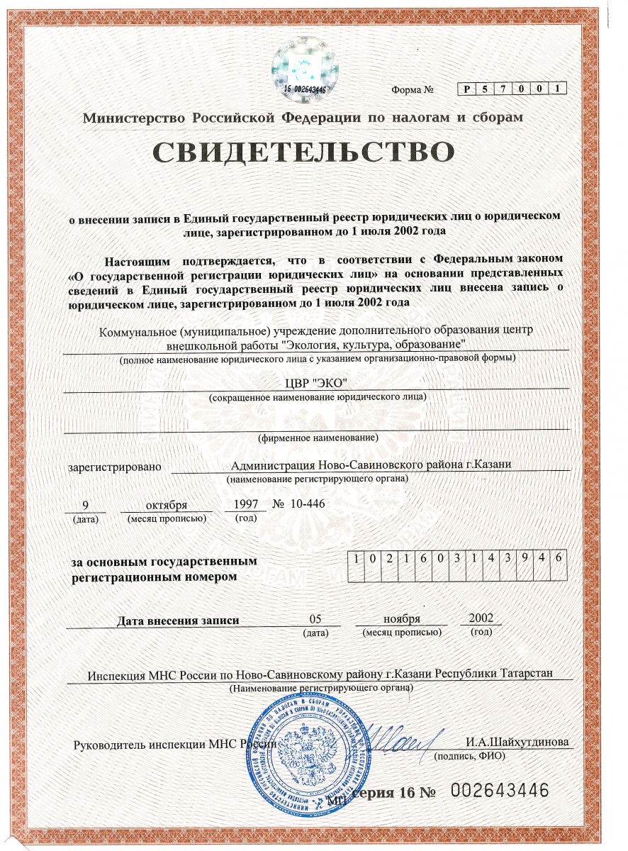 свидетельство о госрегистрации в ЕГРЮЛ