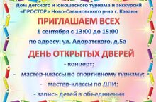 Приглашаем всех желающих на «ДЕНЬ ОТКРЫТЫХ ДВЕРЕЙ», который состоится 1 сентября 2023 года с 13.00 до 15.00 в МБУДО «Дом детского и юношеского туризма и экскурсий «Простор» Ново-Савиновского р-на г. Казани по адресу: г. Казань, ул. Адоратского, д.5а, тел. 556-08-56.