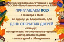 Приглашаем всех желающих на «ДЕНЬ ОТКРЫТЫХ ДВЕРЕЙ», который состоится 5 сентября 2023 года с 16.30 до 18.30 в МБУДО «Дом детского и юношеского туризма и экскурсий «Простор» Ново-Савиновского р-на г. Казани по адресу: г. Казань, ул. Адоратского, д.5а, тел. 556-08-56.