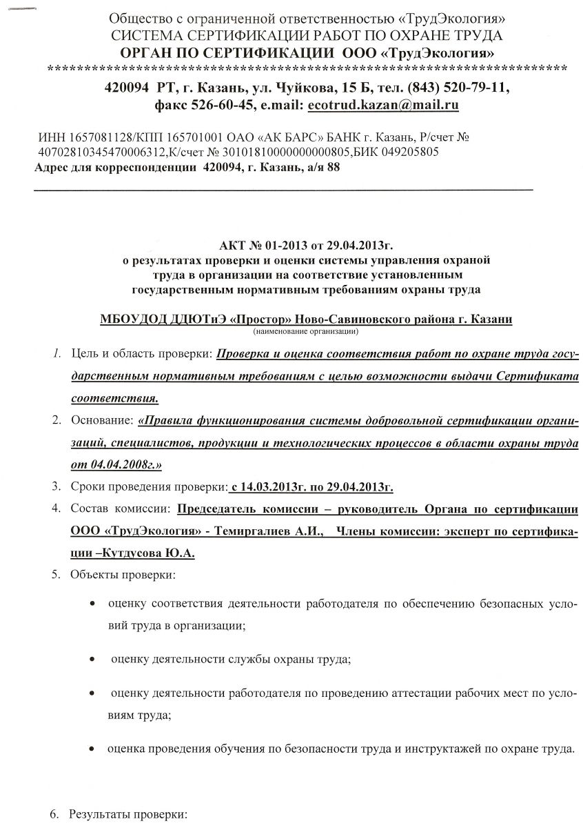 Акт о результатах проверки и оценки системы управления охраной труда