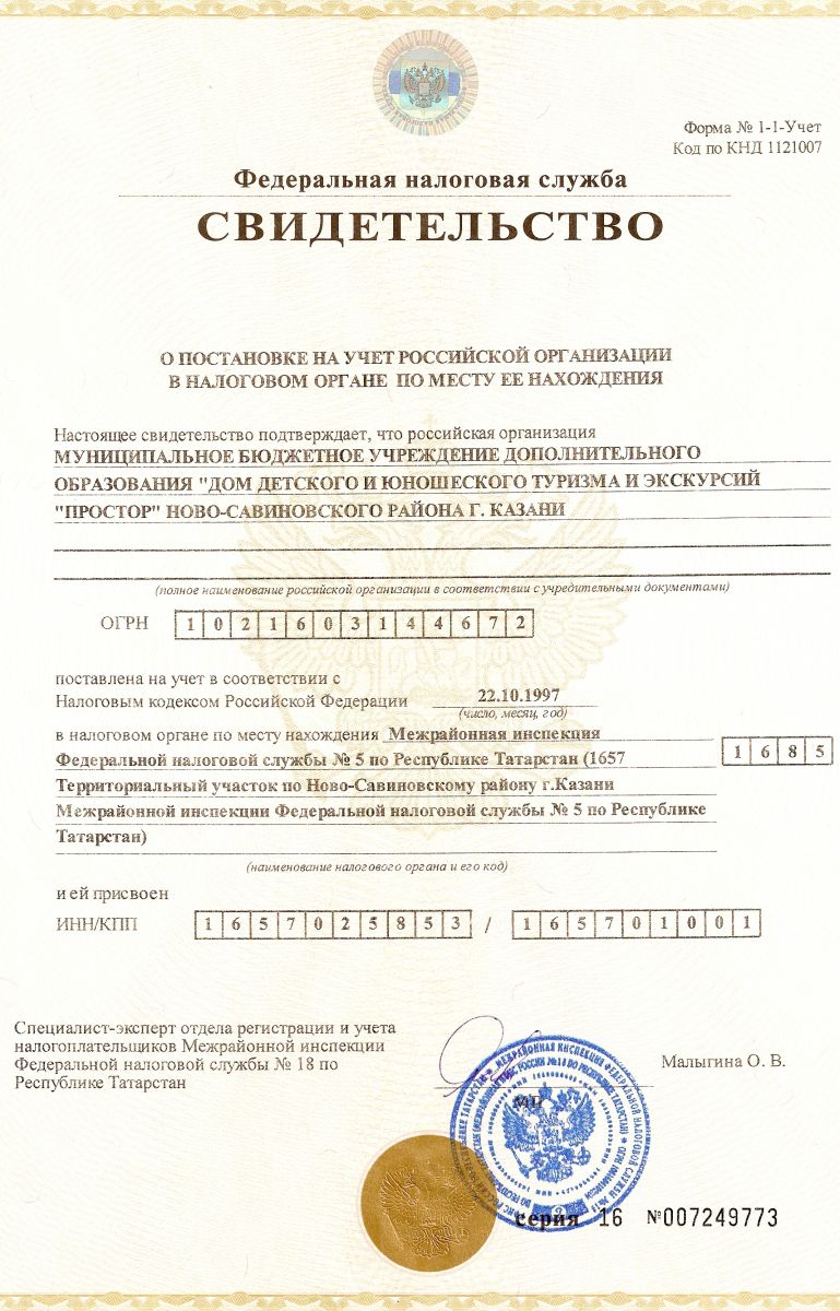 Свидетельство о постановке на учет в налоговом органе