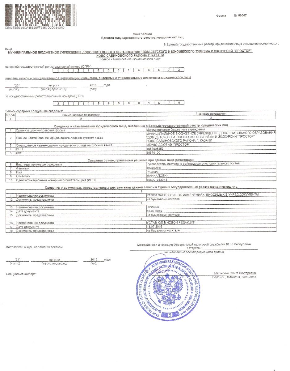 Лист записи Единого государственного реестра юридических лиц