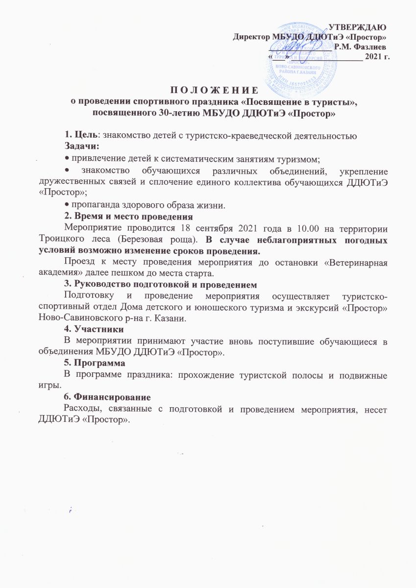 2. Спортивный праздник "Посвящение в туристы" , посвященный 30-летию МБУДО ДДЮТиЭ "Простор". Дата проведения: 18.09.2021