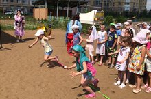 В связи с погодными условиями торжественная часть прошла в группе, а состязались детишки на своем участке. Гостями праздника стали Аби и Бабай, а так же родители. Ребята срезали предмет, прыгали в мешках, носили воду, бились мешками, бегали на 3-х ногах, тянули канат, били горшок, доставали монету из катыка. Каждый заработал не один приз. На праздничном обеде лакомились большим пирогом кабесте и хворостом. После такого праздника в тихий час все заснули "богатырским сном."