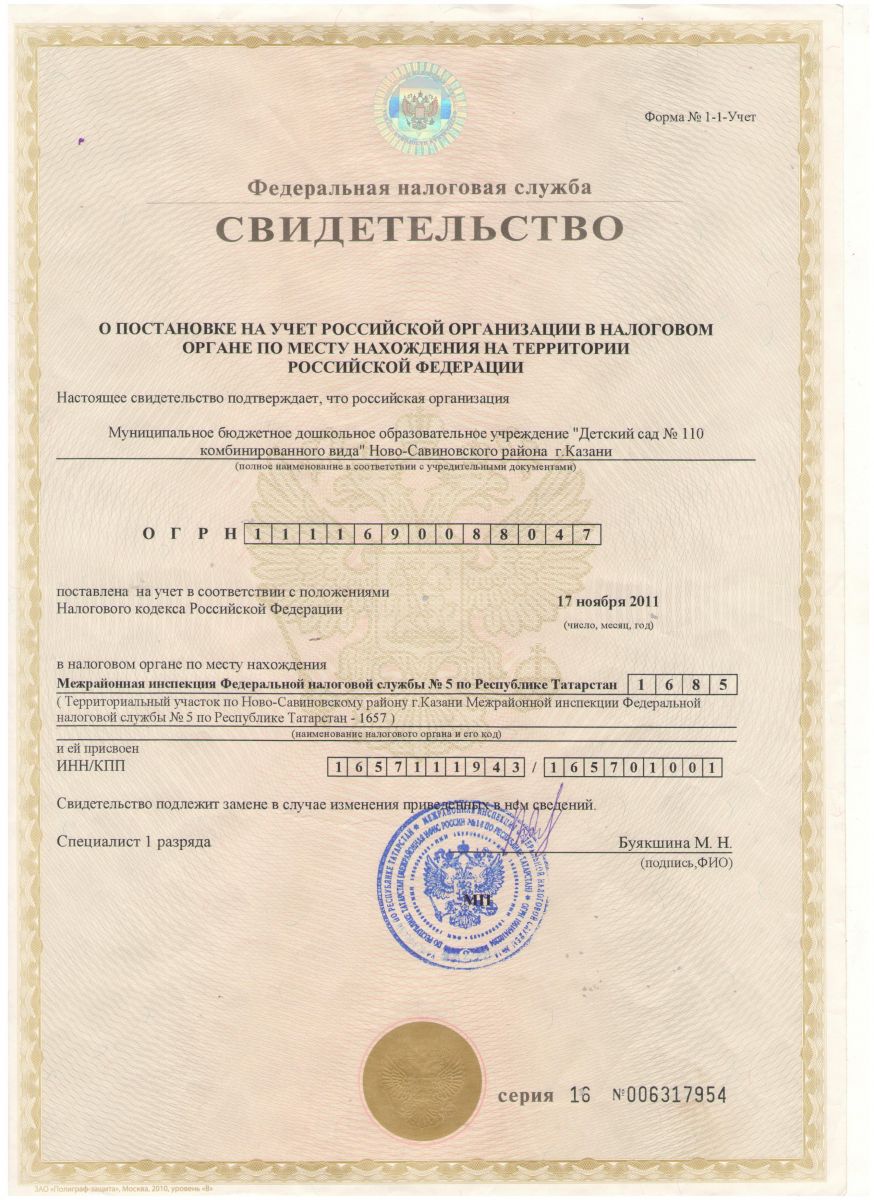 свидетельство о постановке на учет в налоговом органе в качестве юридического лица