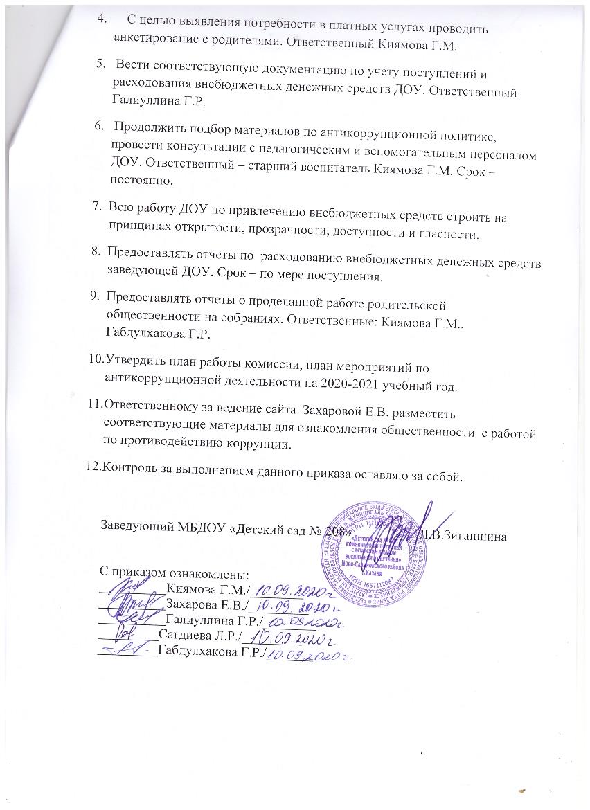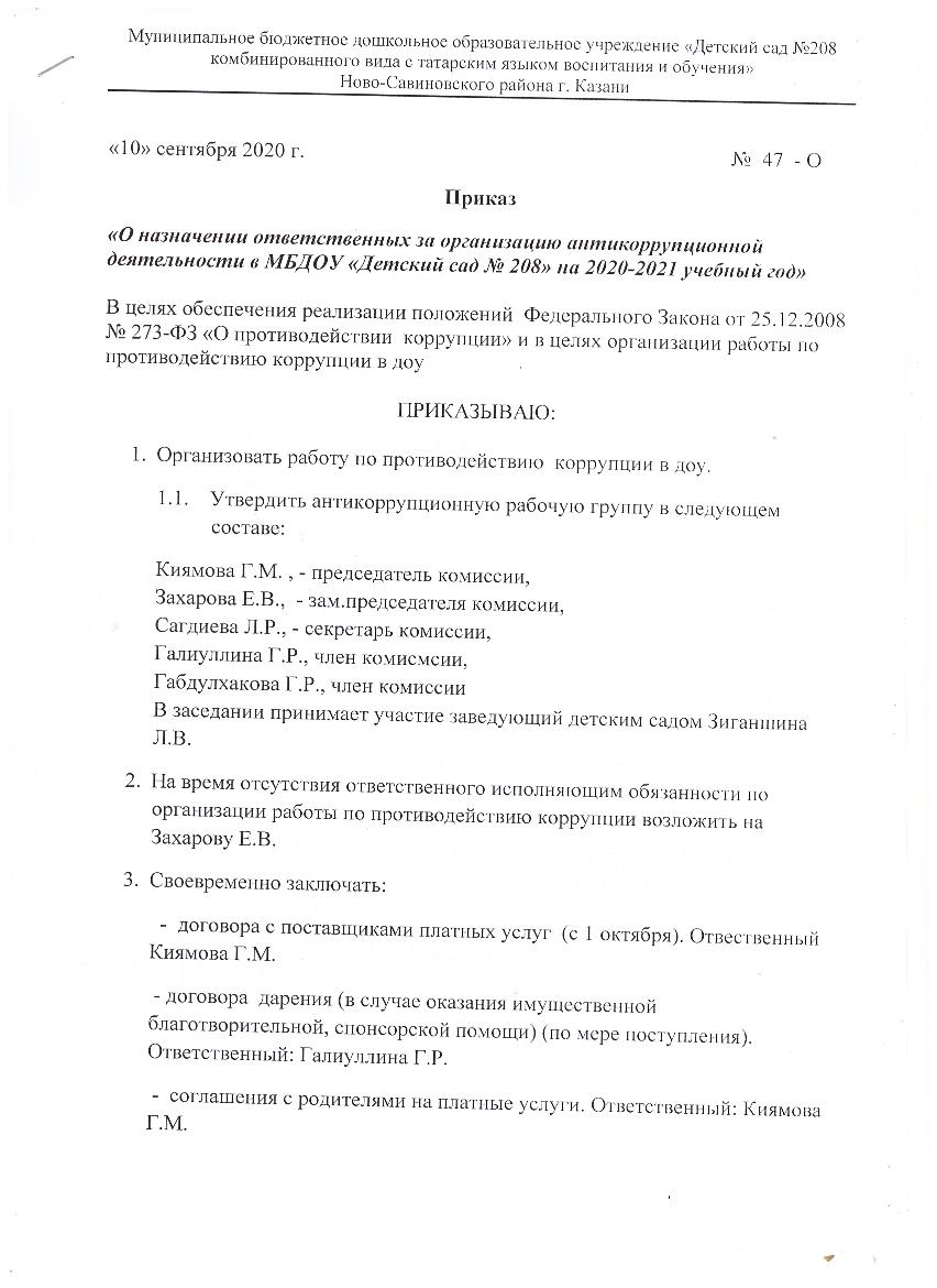 Приказ о назначении ответственных за организацию антикоррупционной деятельности в МБДОУ № 208