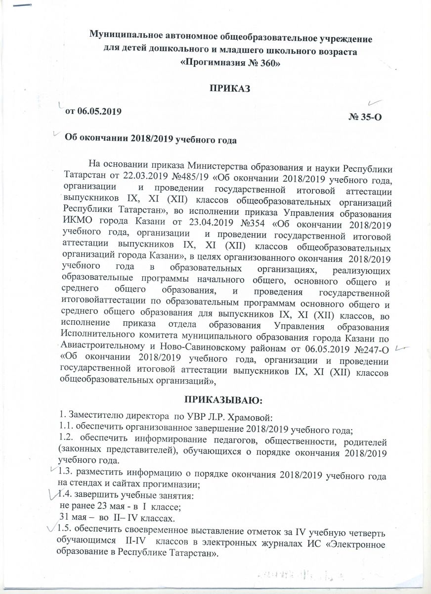 Приказ об окончании 2018-2019 учебного года 22.05.2019