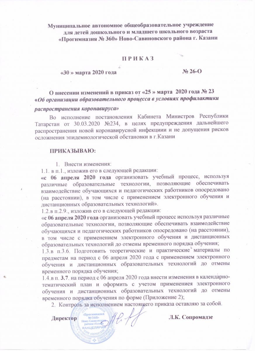 Приказ МАОУ "Прогимназия №360" Об организации образовательного процесса в условиях профилактики распространения коронавируса
